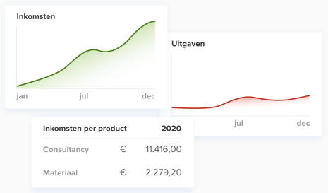 Grafisch inzicht en in één oogopslag zien hoe je bedrijf er nu voor staat. Vergelijk dit jaar met vorig jaar qua kosten, opbrengsten, resultaten en debiteuren naar ouderdom etc. Je hebt de volledige controle over je administratie en rapportage.